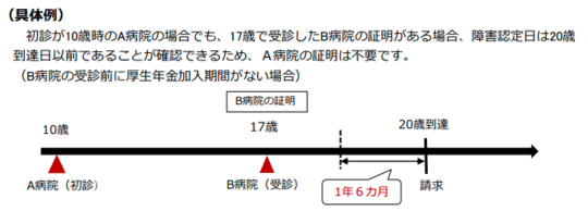 ・初診日証明手続きの簡素化を行った場合は、発病から証明書発行医療機関(下記例のB病院)の受診日までの経過を一括してまとめて記入することが可能です